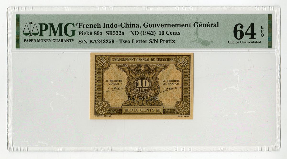 French Indo-China, ND (1942). 10 Cents, P-89a, SB522a, Issued Banknote, Olive green on tan underprint with bank title at top, S/N BA243258, PMG graded Choice Uncirculated 64 EPQ.