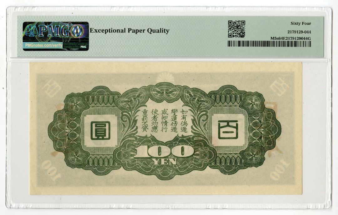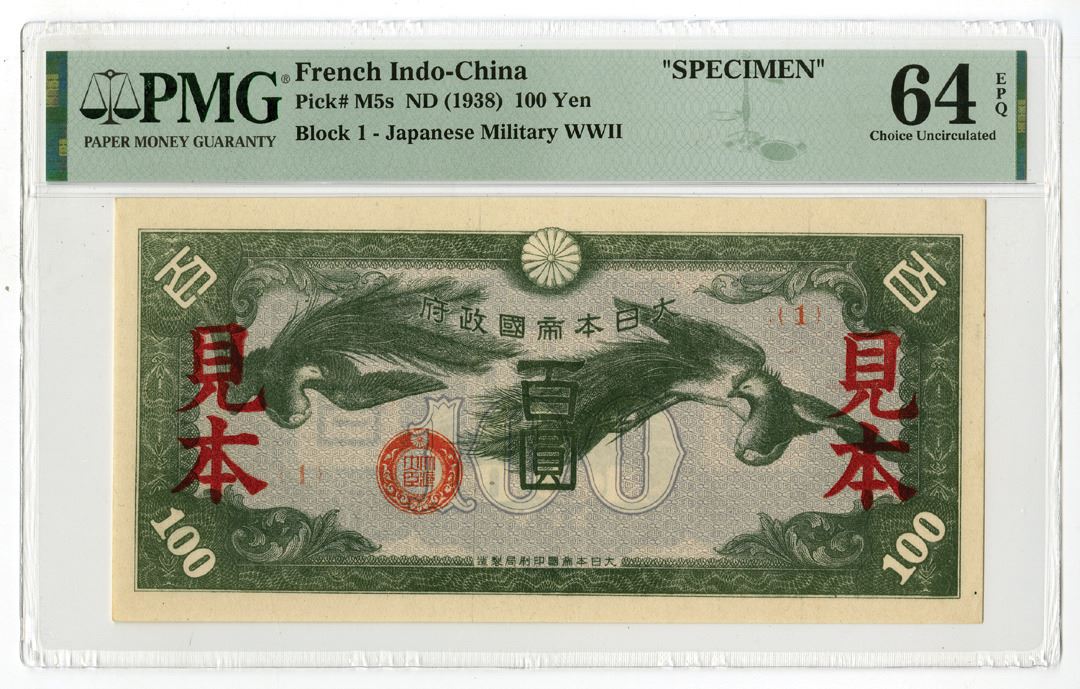 French Indo China. 100 Yen, P-M5s, Specimen banknote, Block 1, Red "Mi-hon" overprint, Blue-green on light lilac underprint, Onagadori Cockerel at left and right, Back olive green, Japanese Occupation, WW II, Japanese Imperial Government, PMG graded Choice Uncirculated 64 EPQ, Attractive high grade note. Only known as a specimen in the SCWPM.