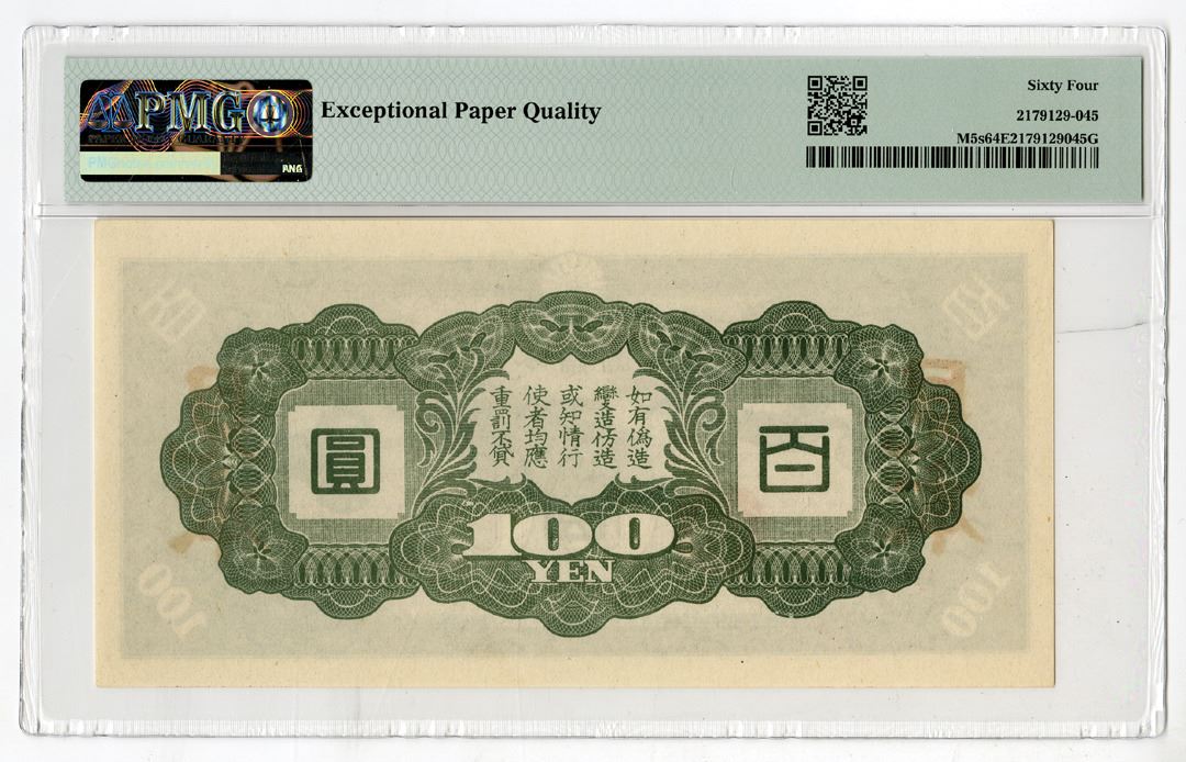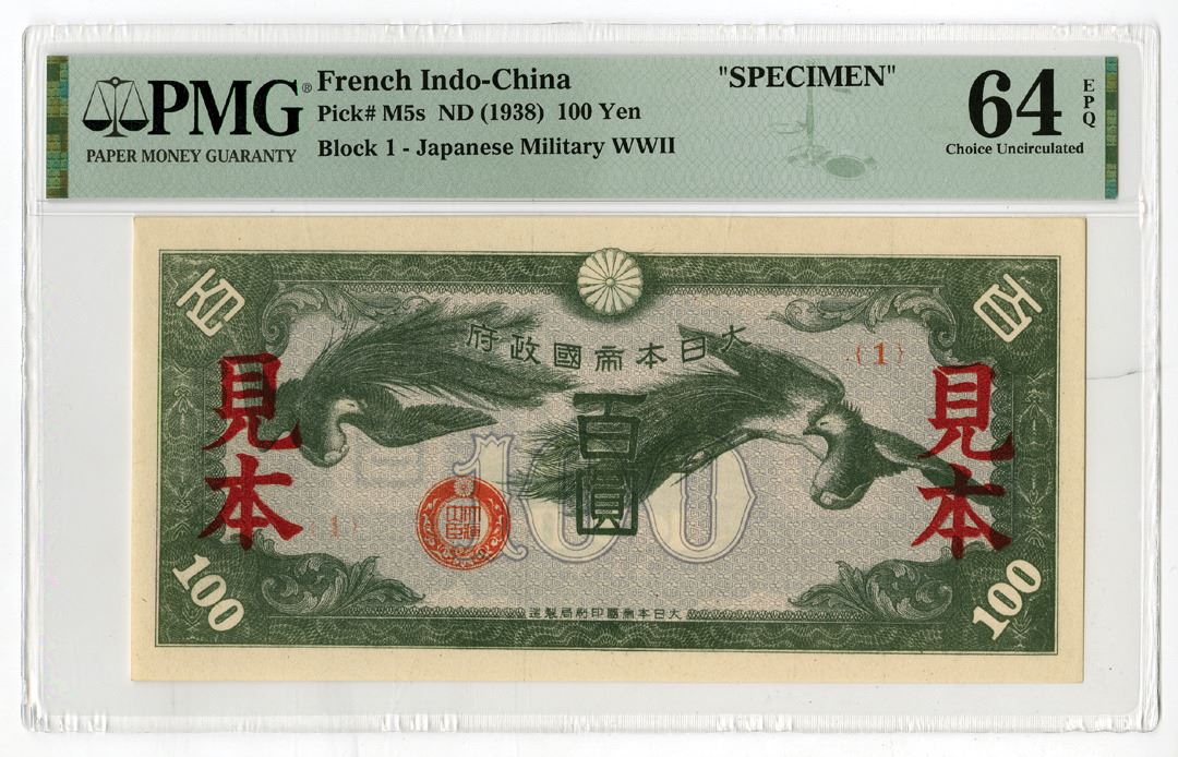 French Indo China. 100 Yen, P-M5s, Specimen banknote, Block 1, Red "Mi-hon" overprint, Blue-green on light lilac underprint, Onagadori Cockerel at left and right, Back olive green, Japanese Occupation, WW II, Japanese Imperial Government, PMG graded Choice Uncirculated 64 EPQ, Attractive high grade note. Only known as a specimen in the SCWPM.