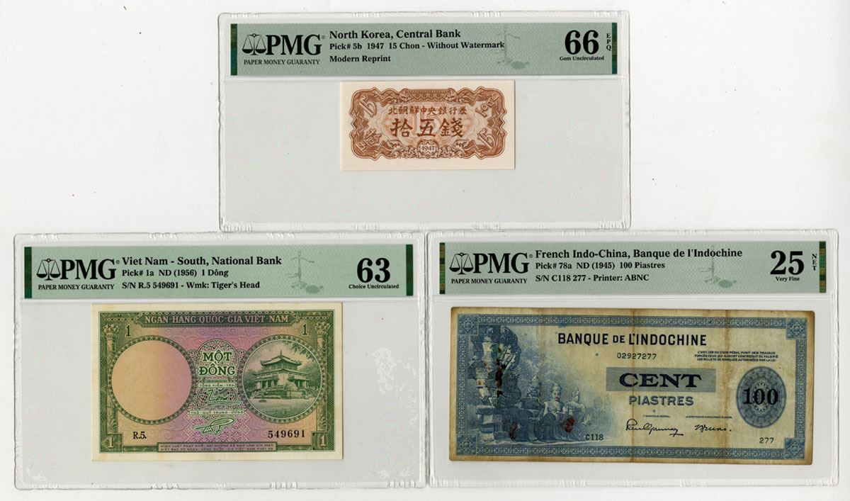 French Indo-China, North Korea, & South Vietnam, 1945-1956. Lot of 3 Issued Banknotes, Includes: Banque de l'Indochine 100 Piastres, P-78a, ND (1945), S/N C118 277, PMG graded Very Fine 25 NET with comments "Rust, Pinholes," ABNC; Central Bank of North Korea 15 Chon, P-5b, 1947, Modern Reprint, PMG graded Gem Unc 66 EPQ; National Bank of Vietnam 1 Dong, P-1a, ND (1956), S/N R.5 549691, PMG graded Choice Unc 63. (3). Sold "AS IS" no returns accepted.