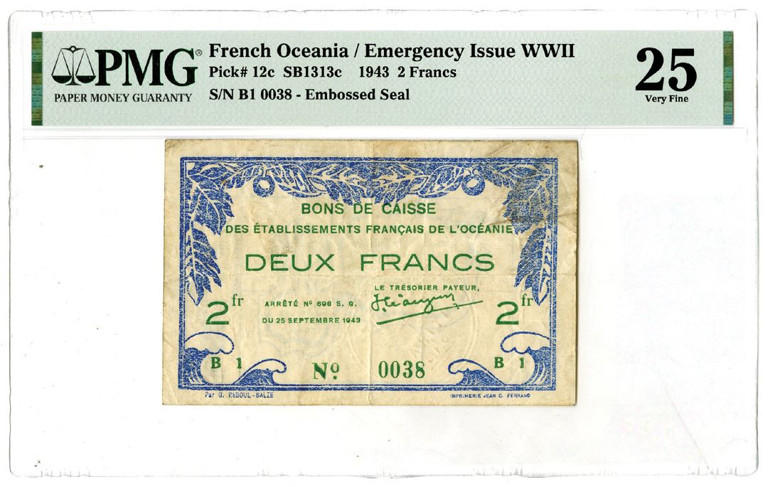French Oceania. 1943. 2 Francs, P-12c SB1313c, Issued banknote, Blue and green, Very low S/N B1 0038 - Embossed Seal, PMG graded Very Fine 25.