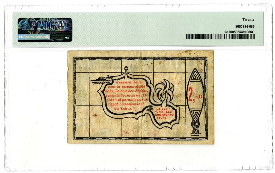 French Oceania. 1943. 2.50 Francs, P-13c, Issued banknote, Black and red, S/N B5 0722 - Embossed Seal, PMG graded Very Fine 20.