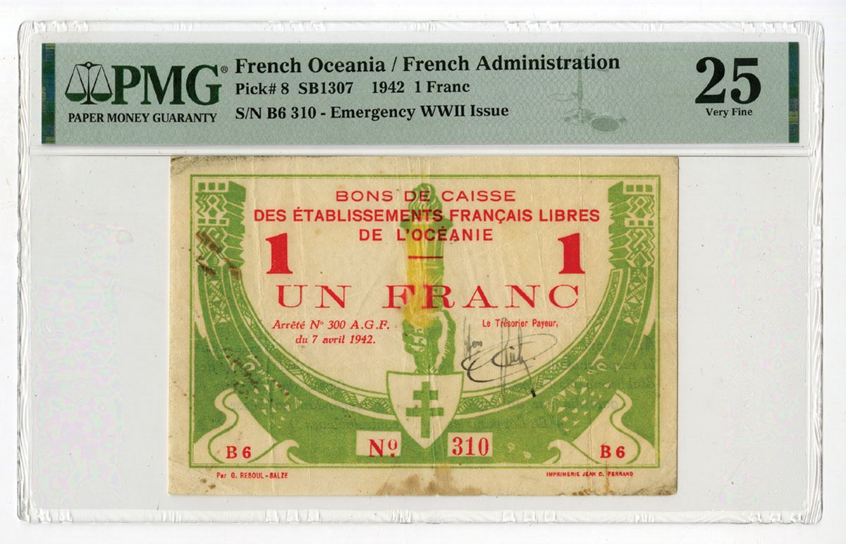 French Oceania - French Administration, 1942. 1 Franc, P-8 SB1307, Emergency WII Issued Banknote, Green and red printing with upright hand holding torch of freedom behind shield of Lorraine at center, Text on back, S/N B6 310, PMG graded Very Fine 25 with comments "Minor Rust, Discoloration." (ex. Allen Berk Collection)