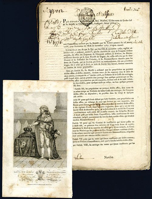 Paris, France, 1767 (1768), 7 Page 13 x 8.75 inches, printed on untrimmed bond type of paper, Alsace loan for 6000 Livres = 300 Livres, Issued historic document from pre revolutionary France. “Rentes” were issued as loans or bonds that would be converted into perpetual annuities. This document was issued to “Jean Francis Yvon, Master Roofer of Paris in the service of the building's of the King, living in Paris.....accepting this document for 300 Livres”. Also included is an 1814 engraving of Louis XVII as well as a detailed translation of the loan document as well as a history of the Seven Years War which was the reason the “Rentes” were created to begin with.