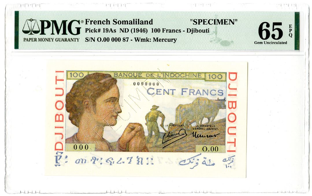 Djibouti (French Somaliland). ND (1946). 100 Francs, P-19As, specimen banknote, perforated SPECIMEN, S/N O.00 000 and hand numbered "87", PMG graded Gem Uncirculated 65 EPQ. (From the Allen Berk Collection)