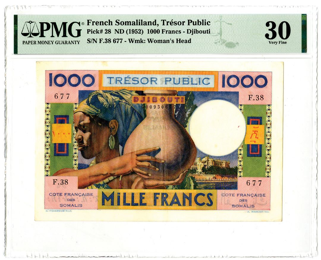 French Somaliland. ND (1952). 1000 Francs - Djibouti, P-28, Issued banknote, Multicolor, S/N F.38 677, Watermark: Woman's Head, PMG graded Very Fine 30 with comment "Pinholes".