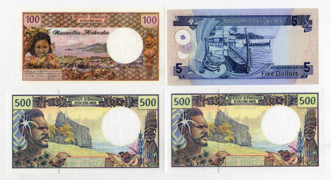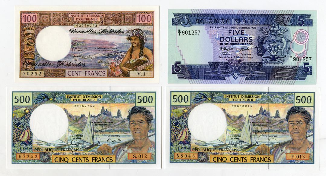 French Pacific Territories....,., New Hebrides, Solomon Islands, ND (1977)-ND(1992). Lot of 4 Issued Banknotes, Includes: Institut d'Emission d'Outre-Mer, 500 Francs, P-1e & P-1, ND (1992); French Pacific Territories, Insitut d'Emission d'Outre-Mer, Nouvelles Hebrides, 100 Francs, P-18d, ND (1977); Central Bank of Solomon Islands, $5, P-14a, ND (1986), Notes range from XF-AU condition. (4). Sold "AS IS" no returns accepted.