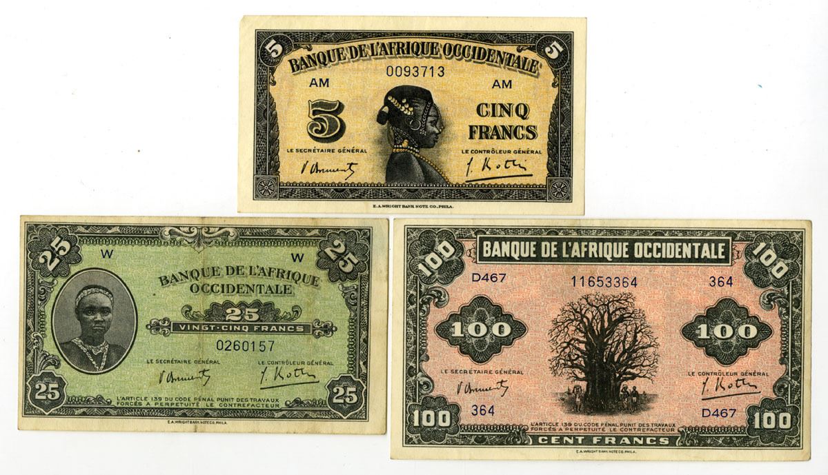 French West Africa, 1942. Lot of 3 Issued Banknotes, Includes: 5 Francs, P-28c, Black on gold underprint with woman at center; 25 Francs, P-30a, Black on green underprint with woman at left; 100 Francs, P-31a, Black on pink underprint with Baobab tree at center. Notes are in VF to XF condition and printed by E.A. Wright. (3). Sold "AS IS" no returns accepted.