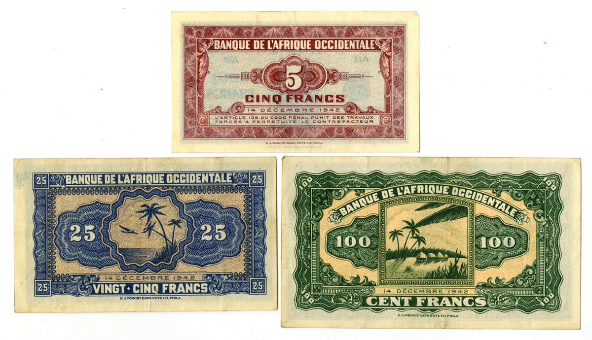 French West Africa, 1942. Lot of 3 Issued Banknotes, Includes: 5 Francs, P-28c, Black on gold underprint with woman at center; 25 Francs, P-30a, Black on green underprint with woman at left; 100 Francs, P-31a, Black on pink underprint with Baobab tree at center. Notes are in VF to XF condition and printed by E.A. Wright. (3). Sold "AS IS" no returns accepted.