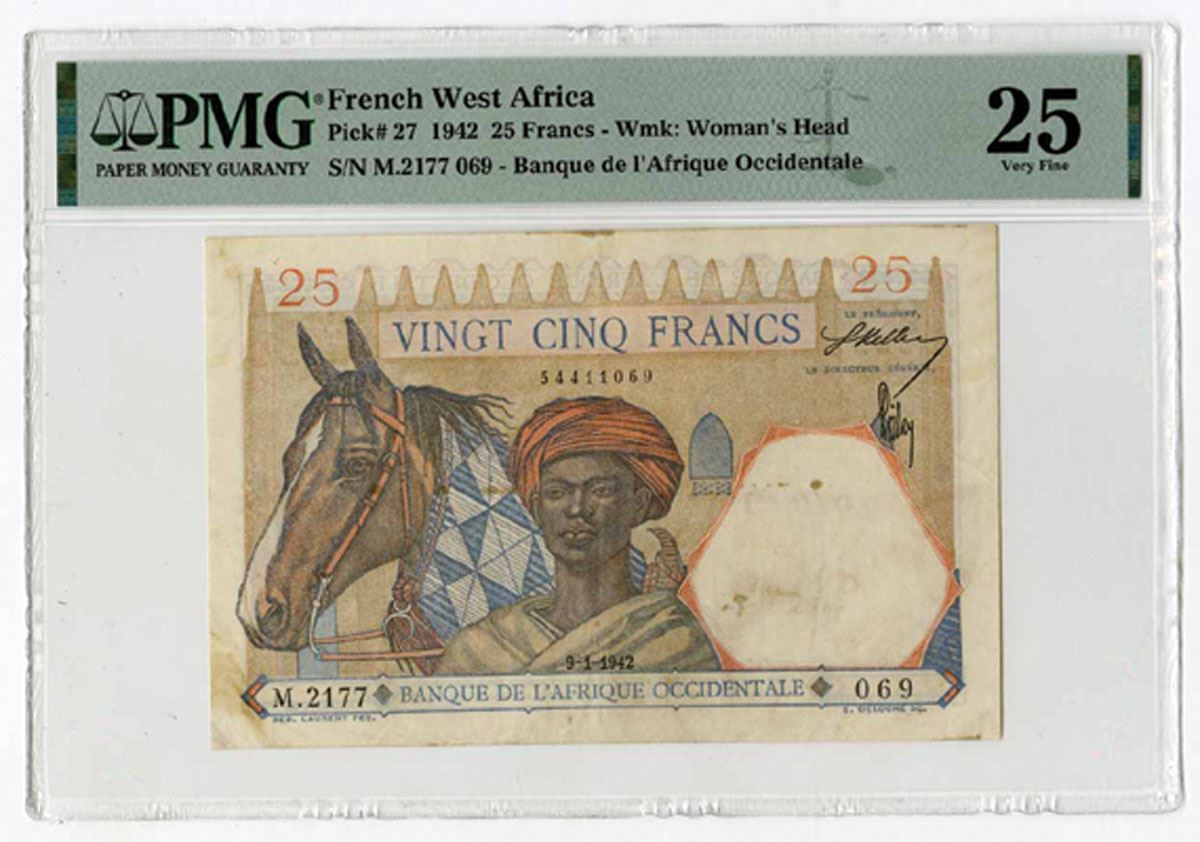 French West Africa, 1942. 25 Francs, P-27, Issued Banknote, M/c printing with man and horse at center, Back is m/c with lion at center, S/N M.2177 069, PMG graded Very Fine 25 with comment "Stained."