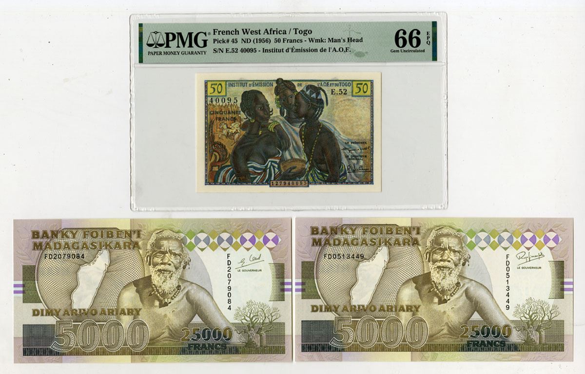 French West Africa & Madagascar, ND (1956 to 1993). Lot of 3 Issued Banknotes, Includes: F.W.A., Institut d'Emission de l'A.O.F., 50 Francs, P-45, ND (1956), S/N E.52 40095, PMG graded Gem Unc 66 EPQ; and, Central Bank of Madagascar, 25,000 Francs = 5000 Ariary, P-74A (2), ND (1993), S/Ns FD0513449 & FD2079084, AU to Unc condition. (3). Sold "AS IS" no returns accepted.