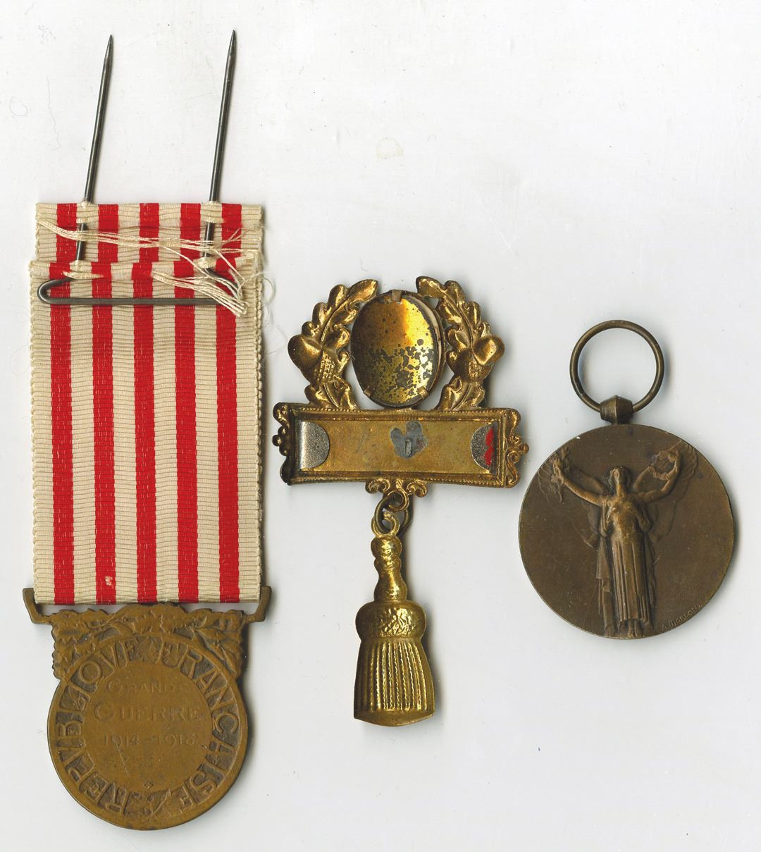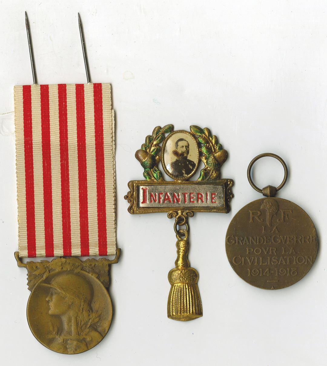 France.... Lot of 3 pieces. Includes: 1914_1918 Commemorative war medal, Red and white striped ribbon attached to a bronze medal featuring Minerva in profile wearing a helmet on obverse, "Grande Guerre 1914-1918" at center surrounded by "Republique Francaise" inscription on reverse. This was awarded to soldiers and sailors for service in World War I. It was also awarded to civilians who met certain requirements; 1914-1918 Inter-Allied Victory medal, bronze medallion with winged figure of victory on front, "La Grande Guerre pour la civilisation 1914-1918" on back. This is a French version of a common allied campaign medal where each allied nation issued a Victory Medal to their own nationals, all issues having certain common features. It was awarded to all soldiers who served three months, consecutive or not, between 2 August 1914 and 11 November 1918 in the war zone. It was also awarded to civilian nurses, aliens (civilian or military) who served directly under French command, Marshals and generals who had a command for at least three months, prisoners of war from Alsace and Lorraine who then served in the French forces; World War I "Infanterie" pin, featuring a portrait of a man at top, surrounded by acorns and laurels, Infanterie in rectangle underneath, dangling object held by metal clasp. Scarce military medals. (3)