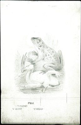 ca.1850's-70's. 56x89x2mm steel die. Image of two frogs (one on his back) on shoreline. Die P311" (crossed out), "V 46249" (engraved three times with two entries crossed out). XF condition. Unique in archive.
