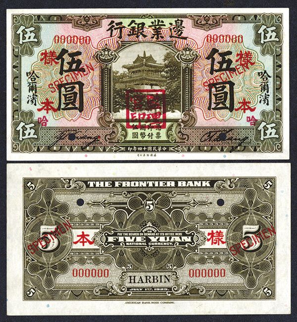 Harbin, China, 1925, 5 Yuan, P-S2570s1 (S/M#P42-62c), Printed uniface on security bank paper, Brown on m/c with 4 Chinese character overprint on face, Specimen overprints, POC's, Uncirculated to CU condition. Scarce specimen. ABNC.