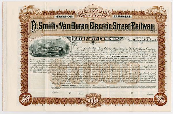 Arkansas. $1,000 Specimen 6% First Mortgage Gold Coupon Bond, Black print on brown border and under tint on horizontal format, Company title at top with small image of street cars below, POC's along bottom, VF-XF condition, St. Louis Bank Note Co. Unlisted railroad in Cox. This is the only example we have seen and the first we have offered.