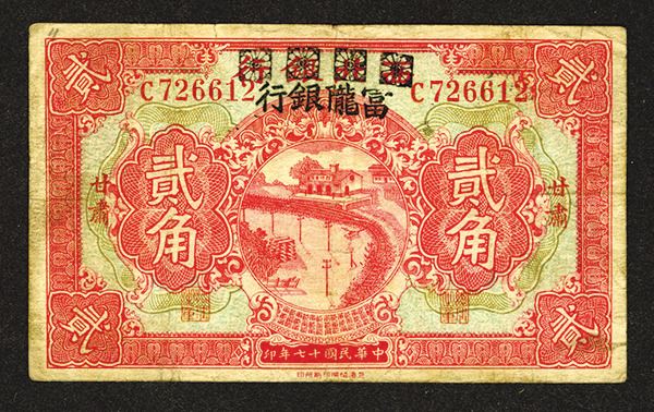 China. 20 Cents. P-S1444. S/M F44-2. Overprint on Kansu note from Bank of the Northwest. Fine.
