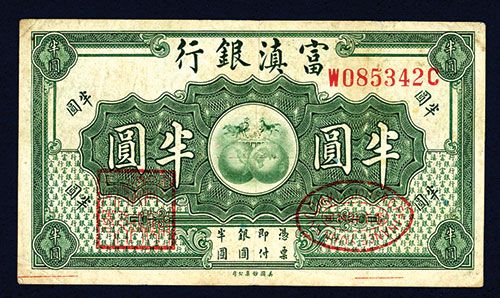 China, ND (1921), 50 cents, P-S3013, (S/M#Y70-13), Issued banknote, Green with red overprints, S/N W085342C, Choice VF to XF condition with 3 vertical folds, Scarce and attractive note, ABNC.