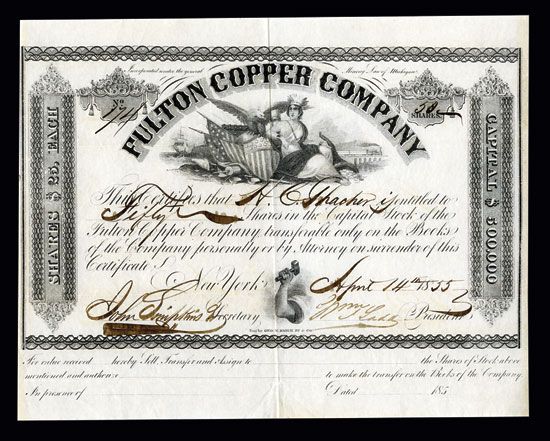 Michigan, 1855, 50 Shares, Issued and Uncancelled, Black with no underprint, Seated allegorical woman, eagle and shield under curved title, arm and hammer on bottom middle, S/N 174, issued to H.C. Thacher, signed by Simpkins as Secretary and Wm. Ladd as president, XF condition, rare with only one previous certificate known and sure to attract serious interest. Geo. W Hatch Jr, & Co.