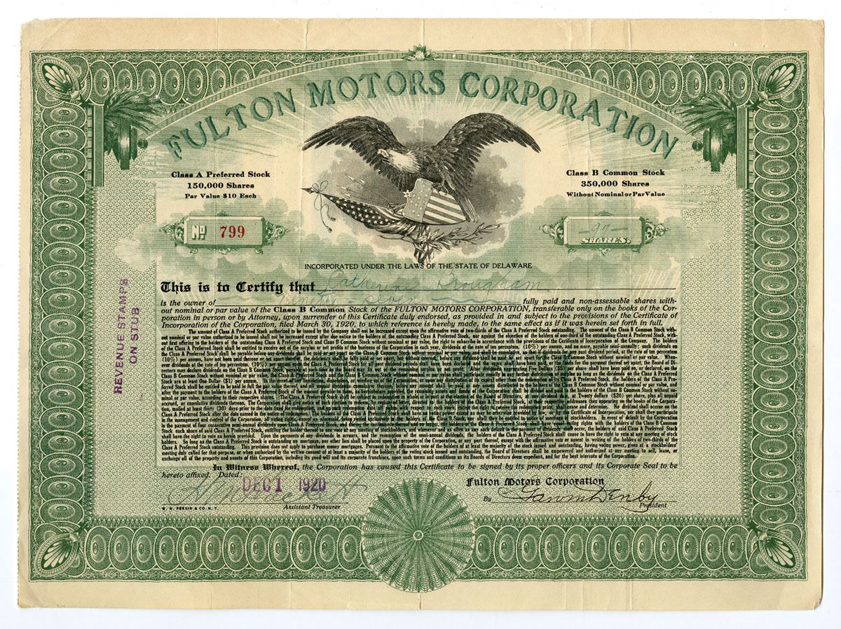 Delaware, 1920. 97 Shares Common Stock I/U Certificate, Black print with green border and underprint, Bald Eagle with flag and shield at top center, S/N 799, VF to XF condition.