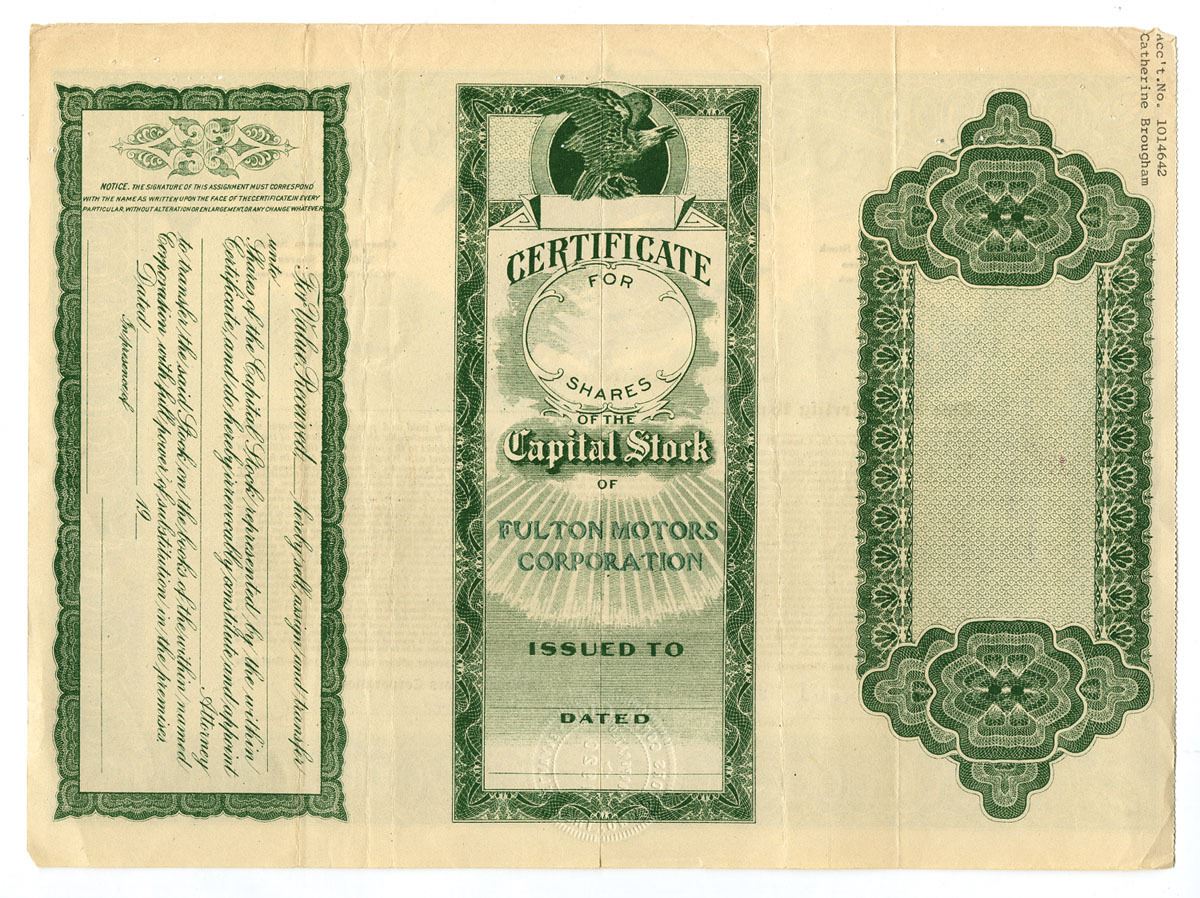 Delaware, 1920. 97 Shares Common Stock I/U Certificate, Black print with green border and underprint, Bald Eagle with flag and shield at top center, S/N 799, VF to XF condition.