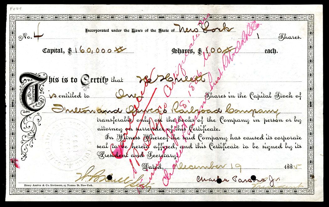 New York, 1 Share, I/C, Generic form, title hand written in, XF, black. VF.