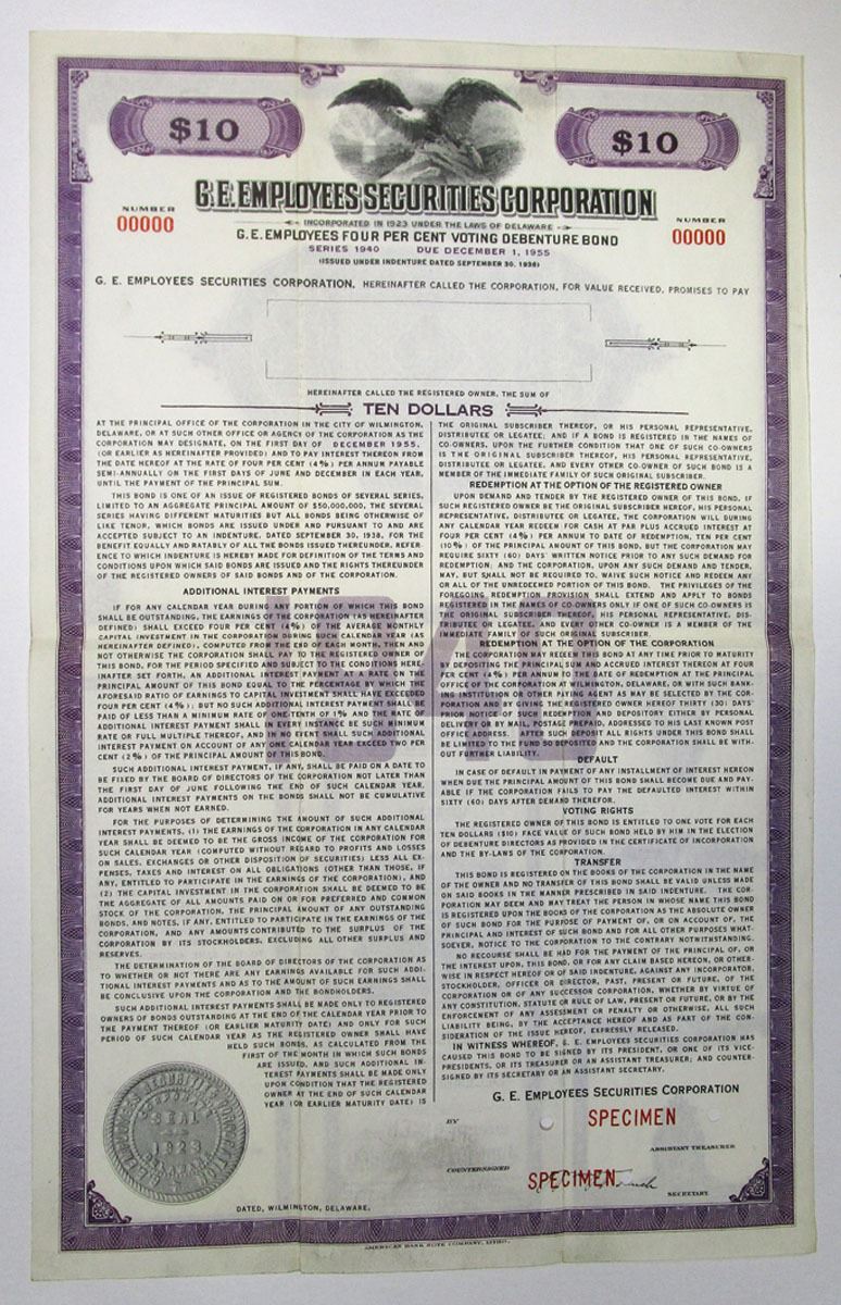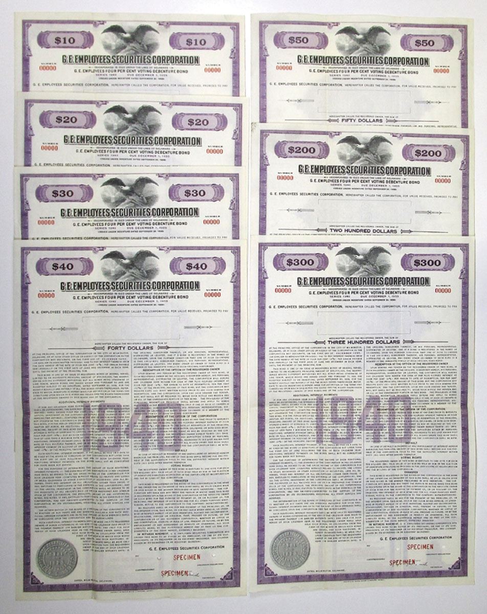 Delaware, 1940. Lot of 7 Specimen Bonds from the G.E. Employees Securities Corp., all are 4% Voting Debenture Bonds in purple, including: $10; $20; $30; $40; $50; $200; and $300. All have specimen overprints, 00000 serial numbers, and POCs. VF condition, ABNC. (7)
