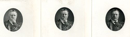 Washington, D.C., ND (ca.1900-1920), Lot of 3 items. All are Progress Large Die Proofs of the same image in various stages of engraving of Theodore Roosevelt, all are 2.25 x 2 inches, printed india on large card, Each card back has blue BEP control or plate numbers, some light toning or soiling on the two partially engraved proofs and the final proof in superb condition, Rare progress proofs by BEP.