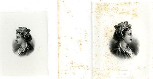 New York, 1879 and 1883, Lot of two Large Die Proofs of mirror images of “Majesty” portraits, both 6 x 9 inches, printed on india on large card, one was used on the Peru, 1879, 10 Soles, VF with foxing and the second was used on Haiti, 1883, 1 Gourde, AU condition, rare banknote vignettes for engraving comparison. ABNC. Both engraved by G.F.C. Smillie.