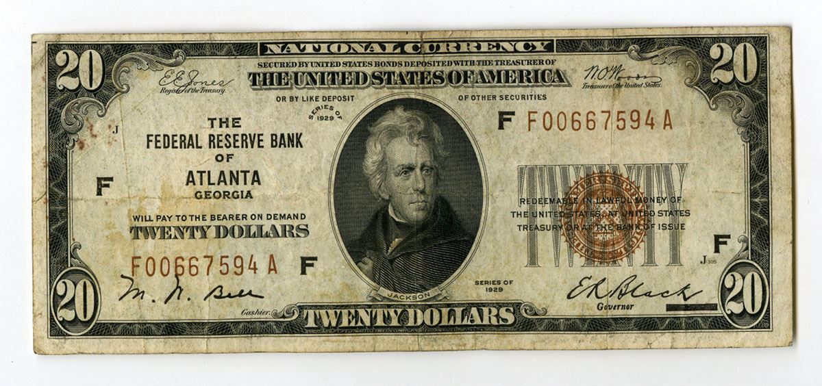 GA. Federal Reserve Bank of Atlanta, Georgia, 1929. $20, Series of 1929, Fr.# 1860-G, Jones | Woods Signatures, brown seal at right, S/N F00667594A, Choice Fine to VF condition.