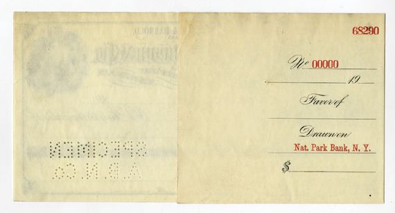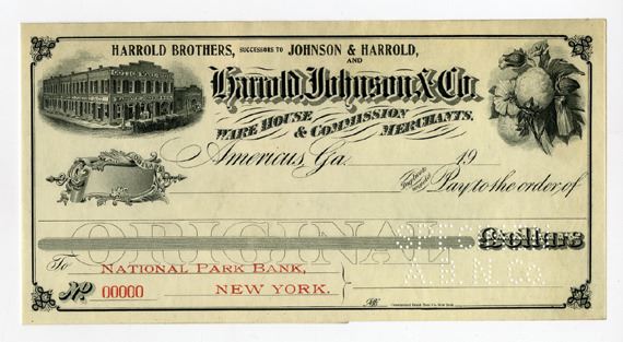 Americus, Georgia, ND (1900-09). Specimen Check with black printing, Warehouse at top left and cotton flower at right, S/N 00000, Pin Punched Specimen at bottom right, AU-Unc. condition. CBNC. Harrold, Johnson & Co. was a prominent warehouse and commission merchant business in Americus, Georgia, during the late 19th and early 20th centuries. The company specialized in handling and trading agricultural products, particularly cotton, providing essential services like storage and sales for farmers. It played a crucial role in the local economy by connecting producers with broader markets and offering financial support. This type of business was integral to the agricultural economy of the South during that period.