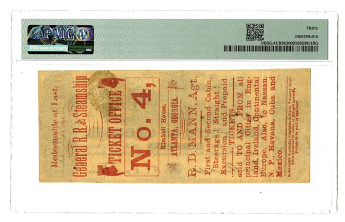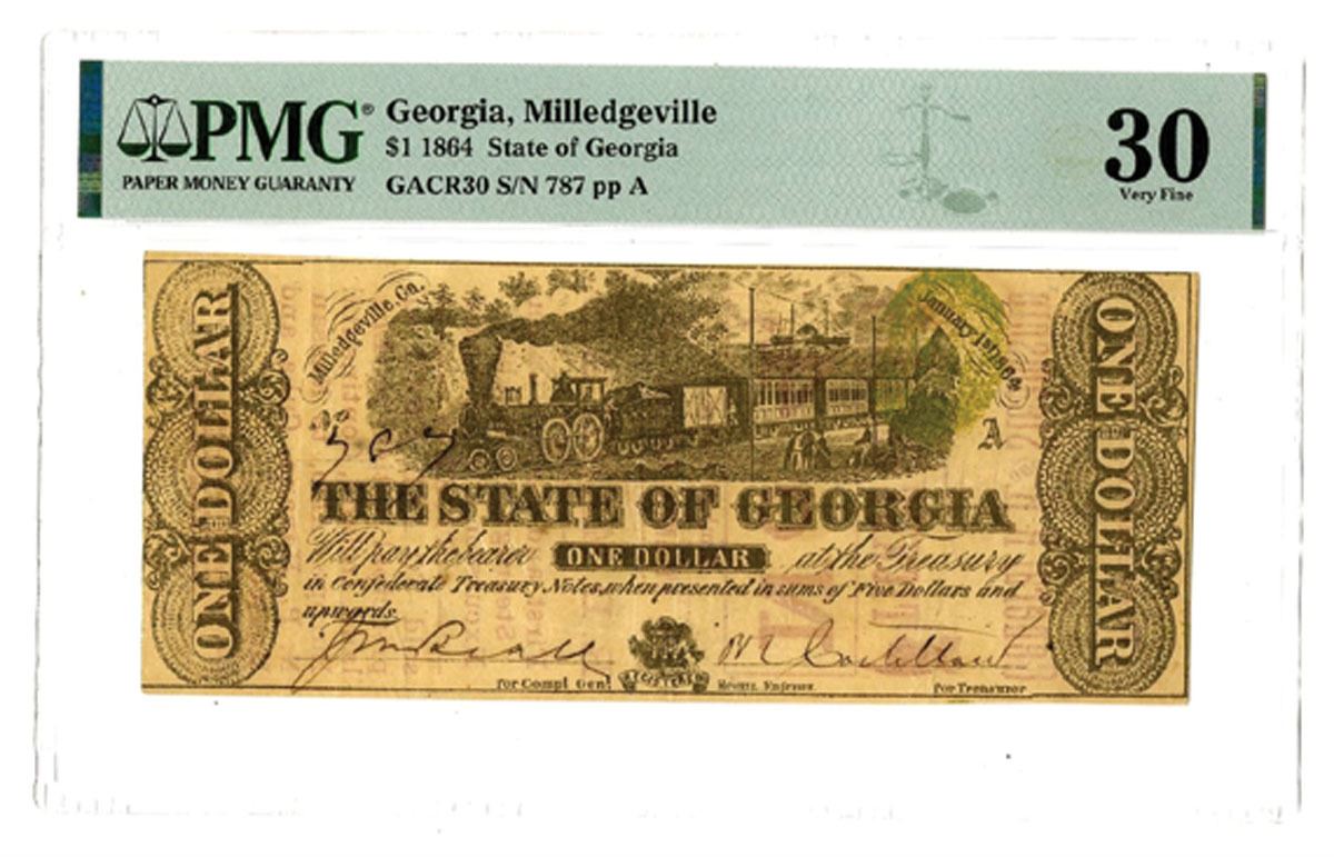 Milledgeville, Georgia, 1864. $1, GA-CR30, P-S863, Issued Banknote, Black with steam passenger train at top center, Green seal at top right, Back is red with advertisement on back, S/N 787 pp A, PMG graded Very Fine 30, Howell Engraver.