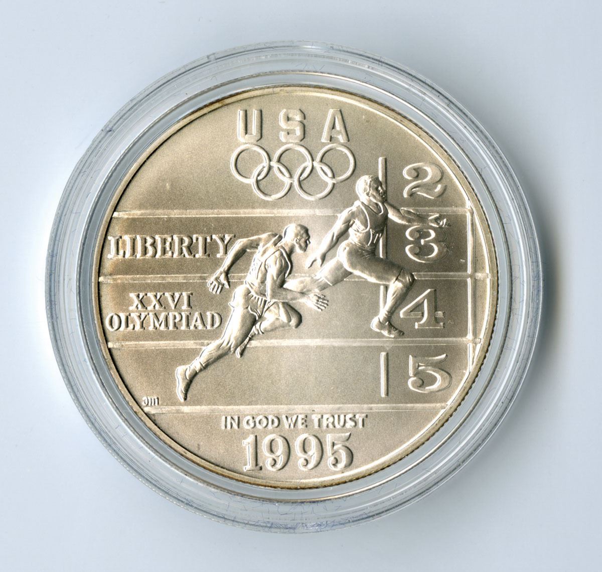 Atlanta, Georgia, 1995. $1, Olympics Commemorative Coin Series, Obverse shows two sprinters racing towards the finish line, Coin is a 1995-D - minted in Denver, 90% Silver, 26.73 grams, AU to UNC condition
