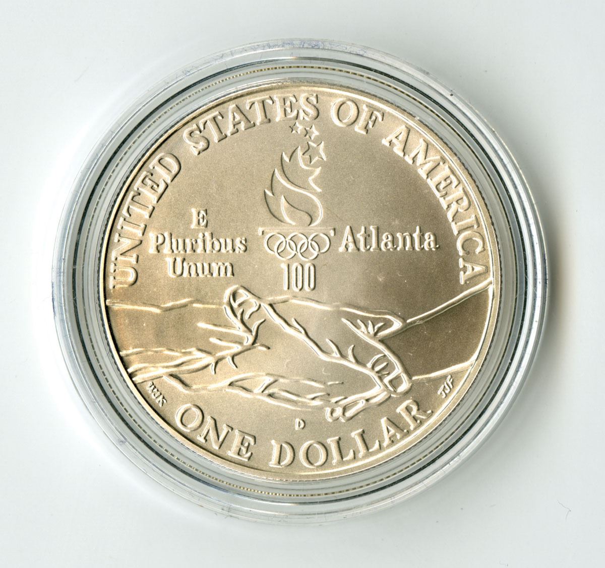 Atlanta, Georgia, 1995. $1, Olympics Commemorative Coin Series, Obverse shows two sprinters racing towards the finish line, Coin is a 1995-D - minted in Denver, 90% Silver, 26.73 grams, AU to UNC condition