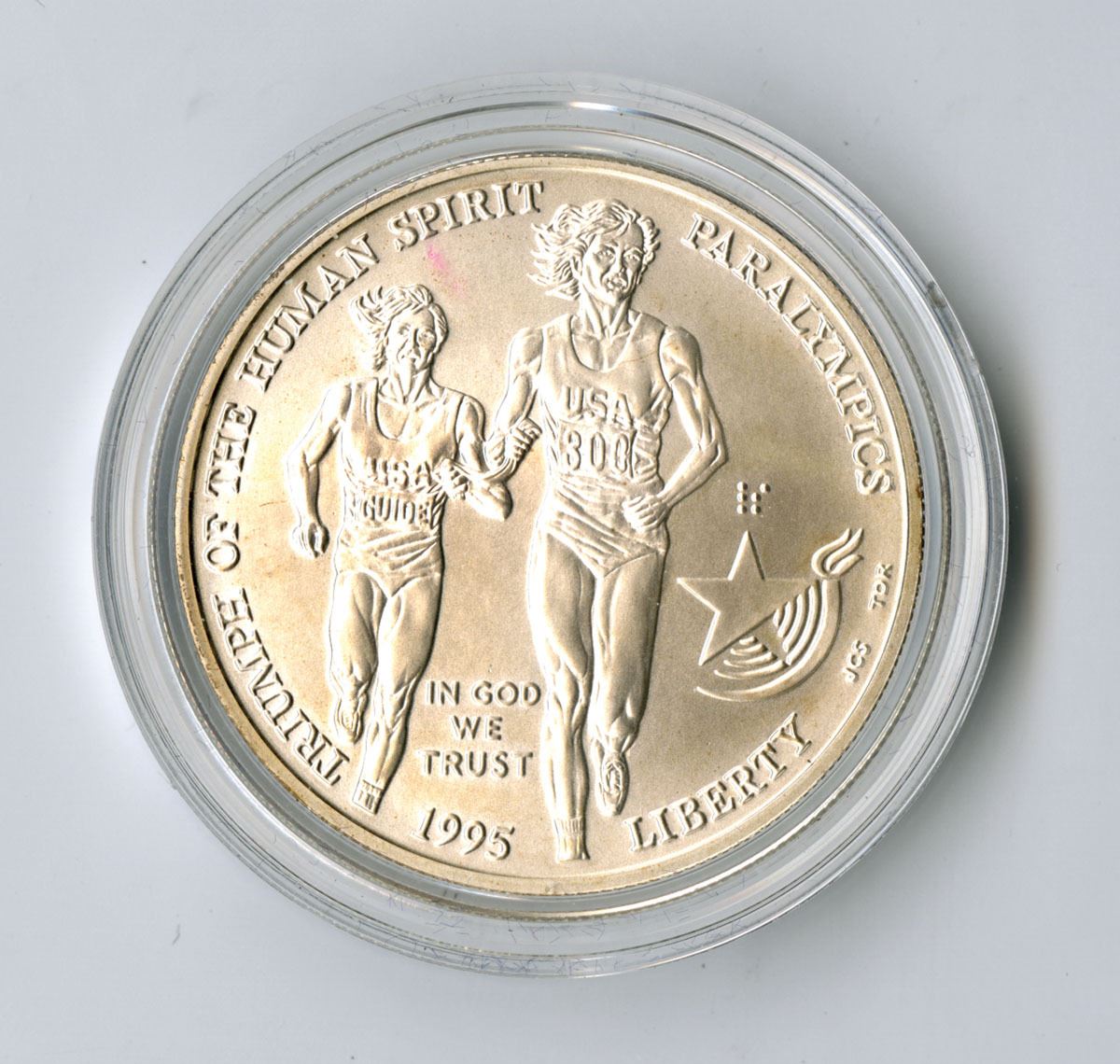 Atlanta, Georgia, 1995. $1, Paralympics Commemorative Coin Series, Obverse shows blin runner tethered to his seeing companion during race along with 'sprit' in Braille and the Paralympics logo at right, Coin is a 1995-D - minted in Denver, 90% Silver, ASW: 0.7734 Troy oz .999 silver. AU to UNC condition.
