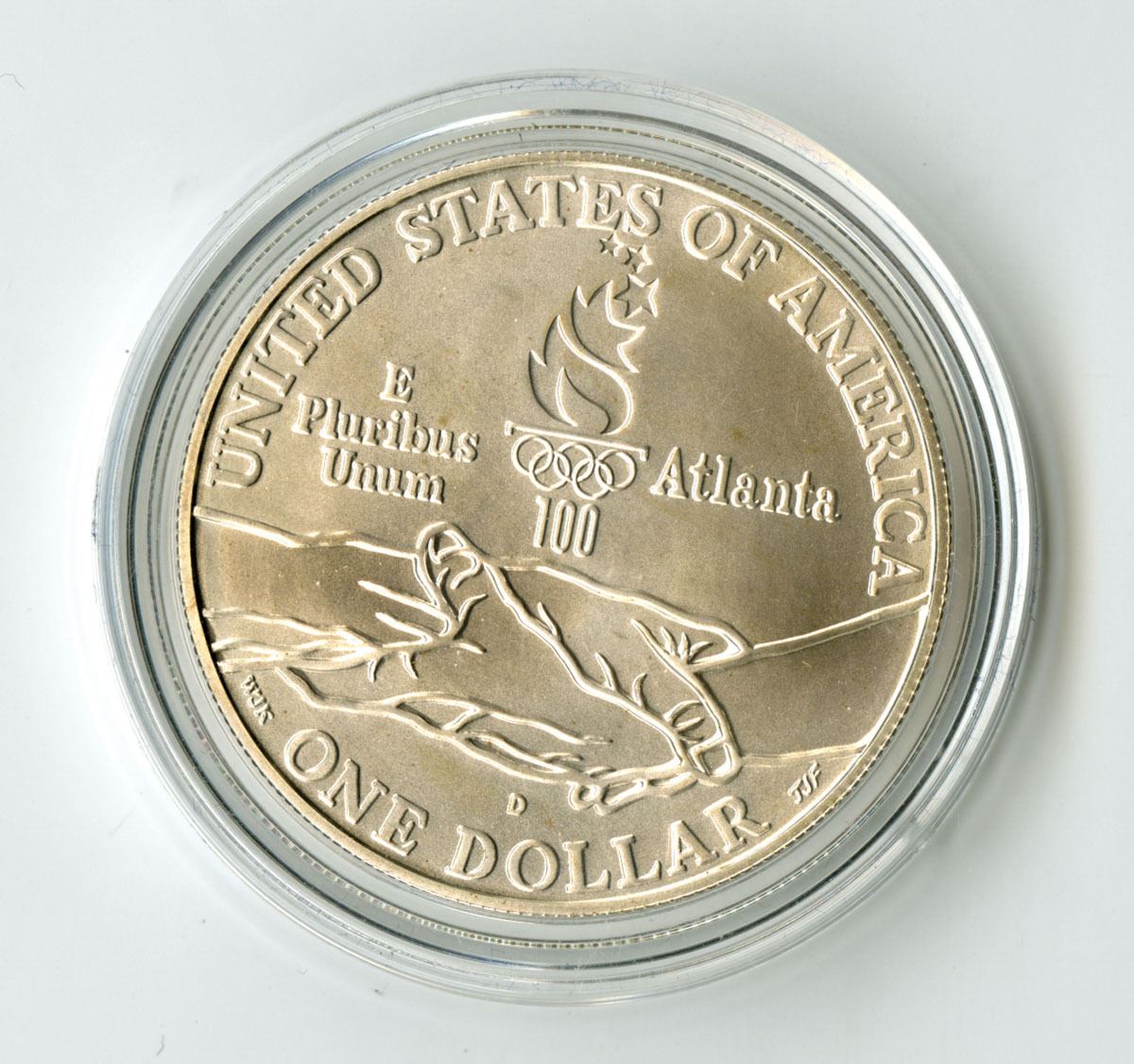 Atlanta, Georgia, 1995. $1, Paralympics Commemorative Coin Series, Obverse shows blin runner tethered to his seeing companion during race along with 'sprit' in Braille and the Paralympics logo at right, Coin is a 1995-D - minted in Denver, 90% Silver, ASW: 0.7734 Troy oz .999 silver. AU to UNC condition.