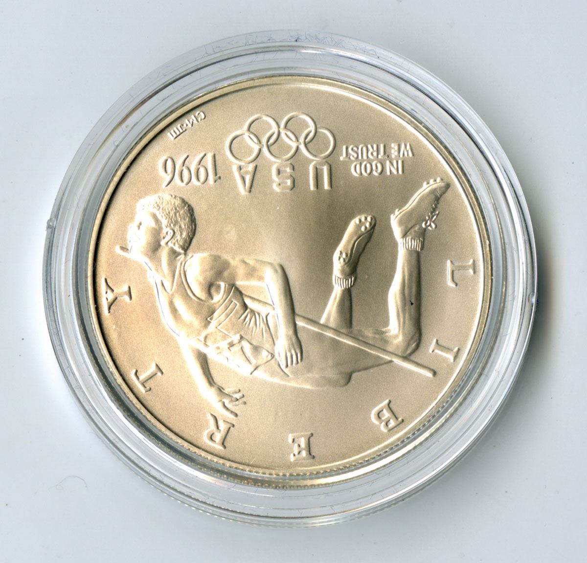 Atlanta, Georgia, 1996. $1, Olympics Commemorative Coin Series, Obverse shows athlete executing high jump employing the Fosbury Flop technique with Olympic rings below, Coin is a 1996-D - minted in Denver, 90% Silver, 26.73 grams, AU to UNC condition.