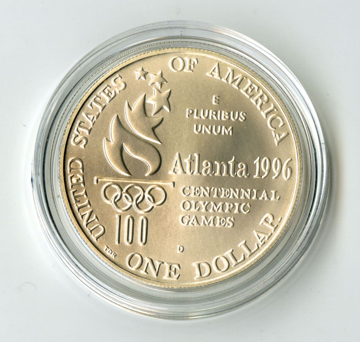 Atlanta, Georgia, 1996. $1, Olympics Commemorative Coin Series, Obverse shows athlete executing high jump employing the Fosbury Flop technique with Olympic rings below, Coin is a 1996-D - minted in Denver, 90% Silver, 26.73 grams, AU to UNC condition.