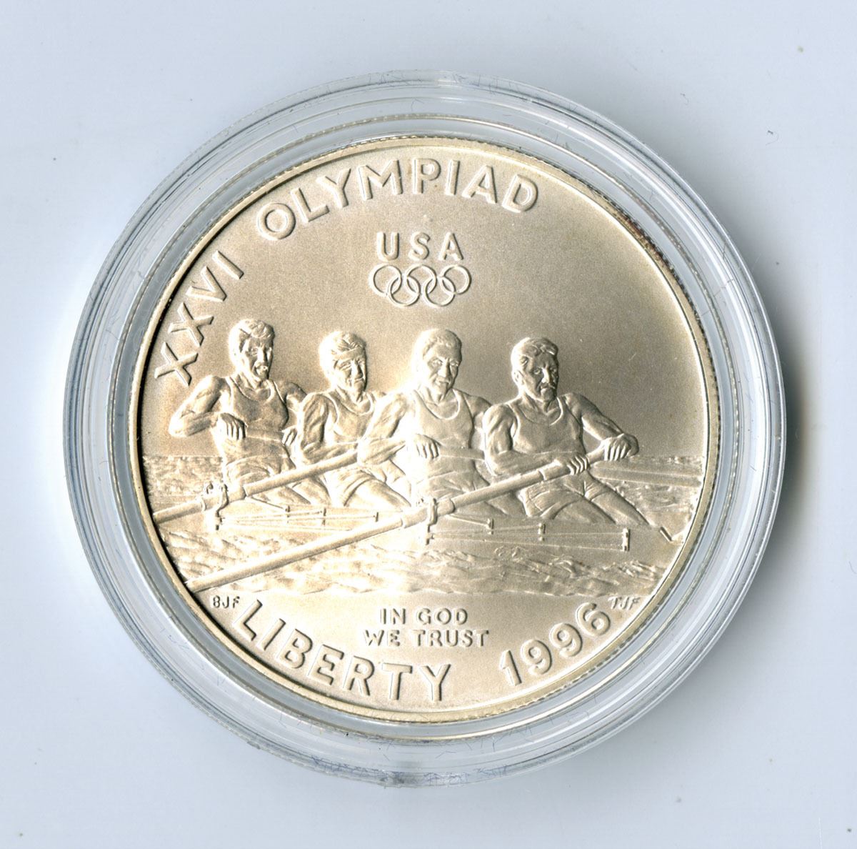 Atlanta, Georgia, 1996. $1, Olympics Commemorative Coin Series, Obverse shows four men rowing with Olympic rings above, Coin is a 1996-D - minted in Denver, 90% Silver, 26.73 grams, AU to UNC condition.