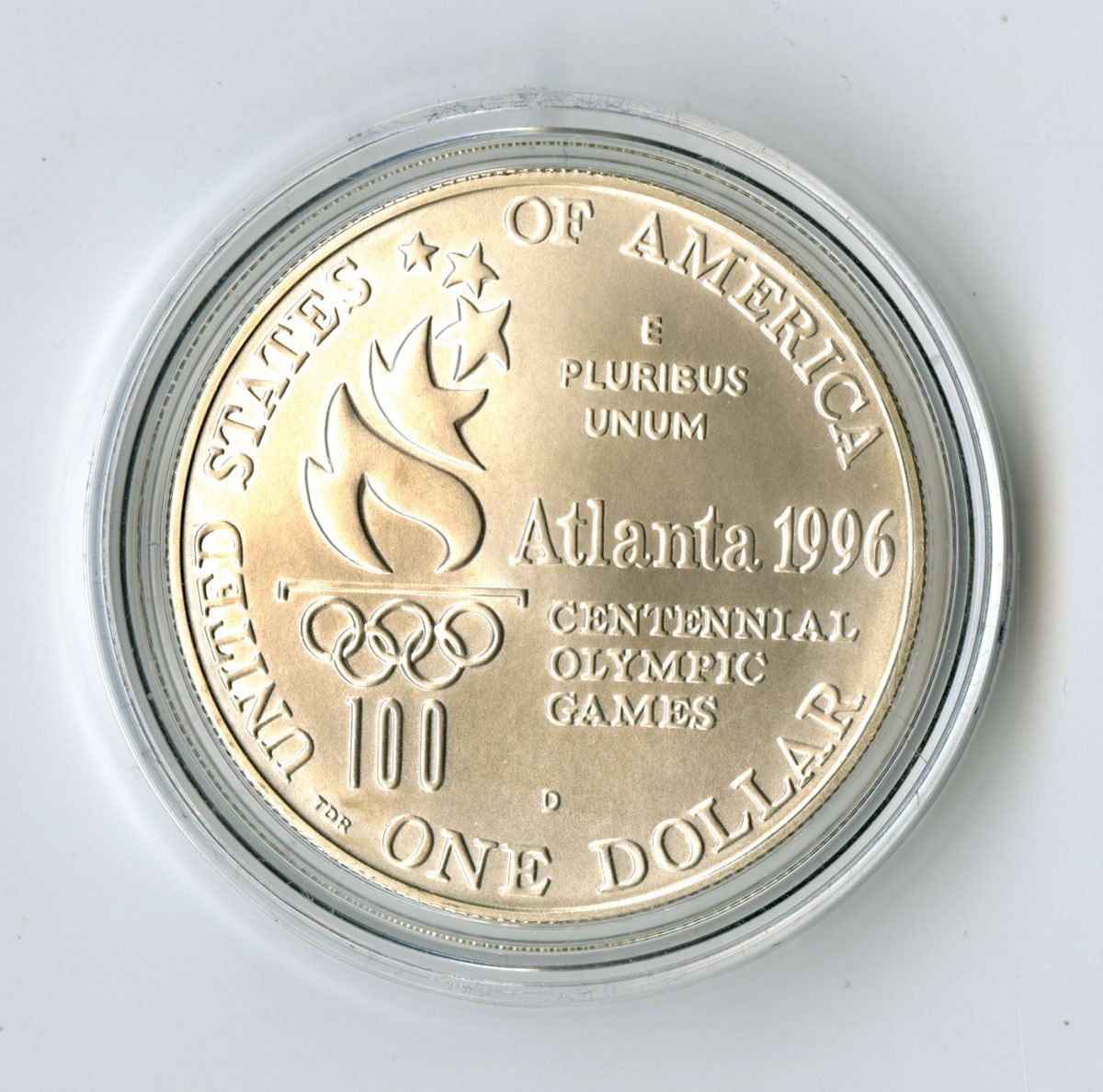 Atlanta, Georgia, 1996. $1, Olympics Commemorative Coin Series, Obverse shows four men rowing with Olympic rings above, Coin is a 1996-D - minted in Denver, 90% Silver, 26.73 grams, AU to UNC condition.