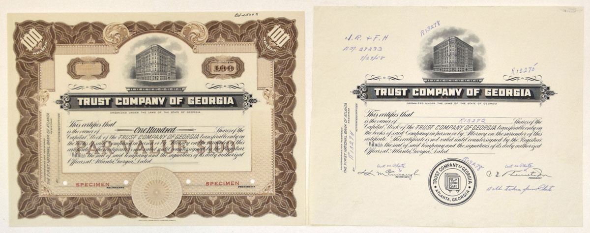 Georgia, 1958. Lot of 2 Certificates, Includes: Proof Stock Certificate, Black print on thick white paper, Company seal at bottom with vignette at top center with text, no borders or undertint, Archival notations cover document; an, 100 Shares Capital Stock Specimen Certificate, Black print with brown border, Specimen overprints and POCs with archival notation at top right corner, Certificates are in AU to UNC condition. SCBNC. (2).