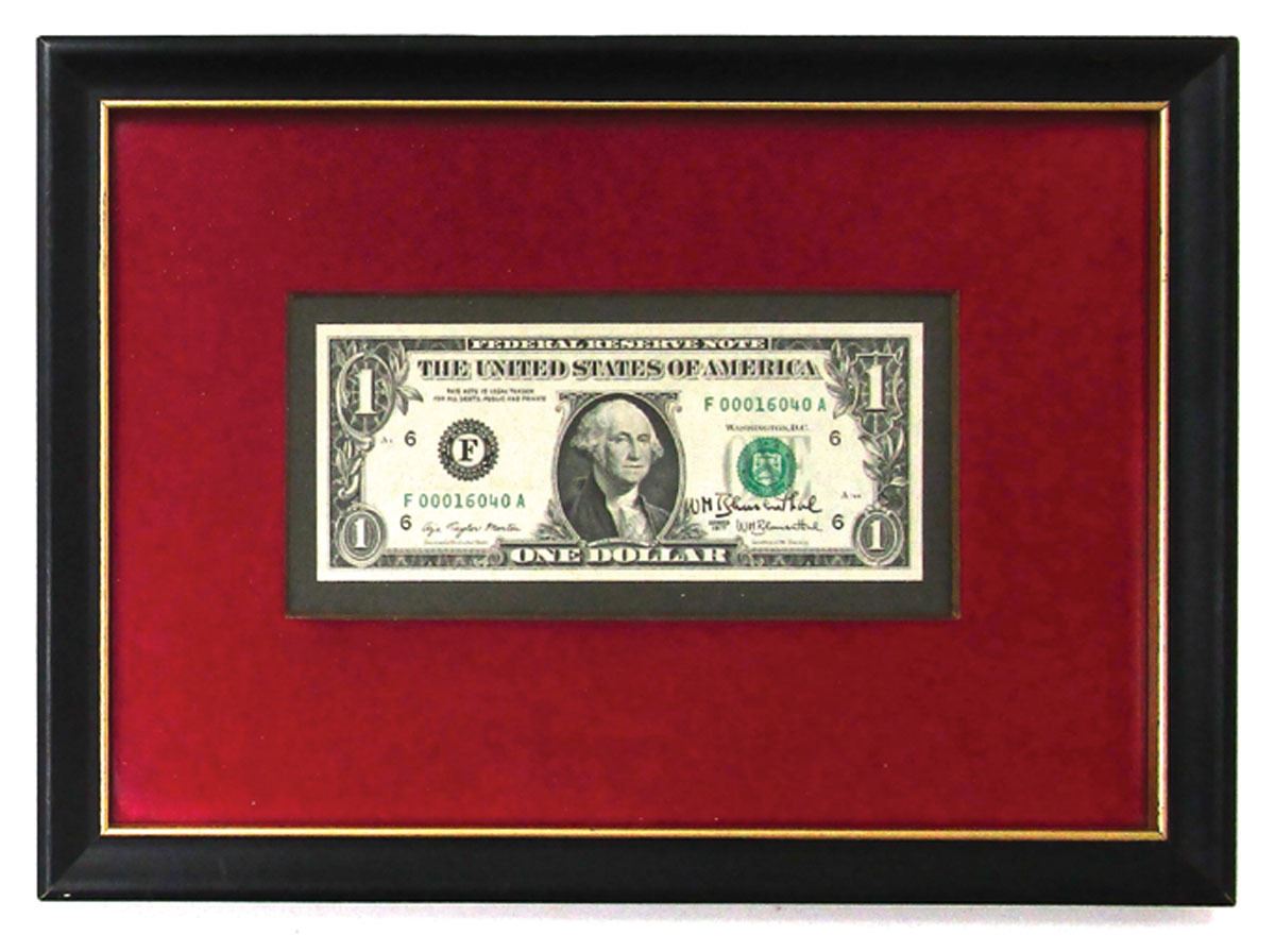 Atlanta, Georgia, 1977. $1, P-462a, Series of 1977, Fr. 1909F, Issued Banknote, Black print with George Washington at center and green seal at right, S/N F00016040A pp A744, Morton | Blumenthal signatures with W. M. Blumenthal's signature over, Framed banknote, Choice AU to CU Condition.