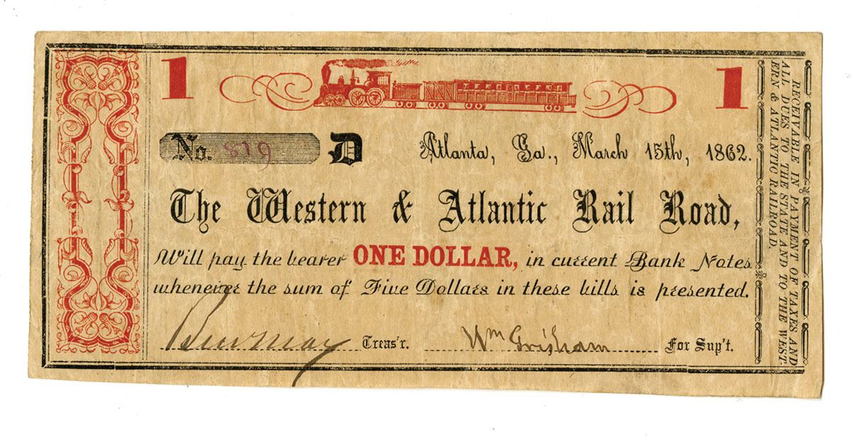 Atlanta, Georgia, 1862. $1 I/U Obsolete Banknote, Black and red print with simple black border, Red locomotive at top center, S/N 819, VF condition with large and even margins.