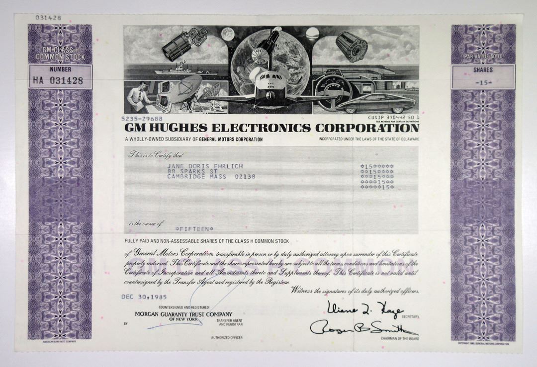 DE. GM Hughes Electronics Corp., a Wholly-owned subsidiary of General Motors Corporation, 15 Shares I/U Class H 15 Shrs Stock Certificate, VF ABNC. Space Shuttle in middle flanked by automobile, satellites and radars, GM Hughes Electronics is a wholly-owned subsidiary of General Motors. Hughes Electronics Corporation was formed in 1985 when Hughes Aircraft was sold by the Howard Hughes Medical Institute to General Motors for $5.2 billion. The surviving parts of Hughes Electronics are today known as the DirecTV Group.