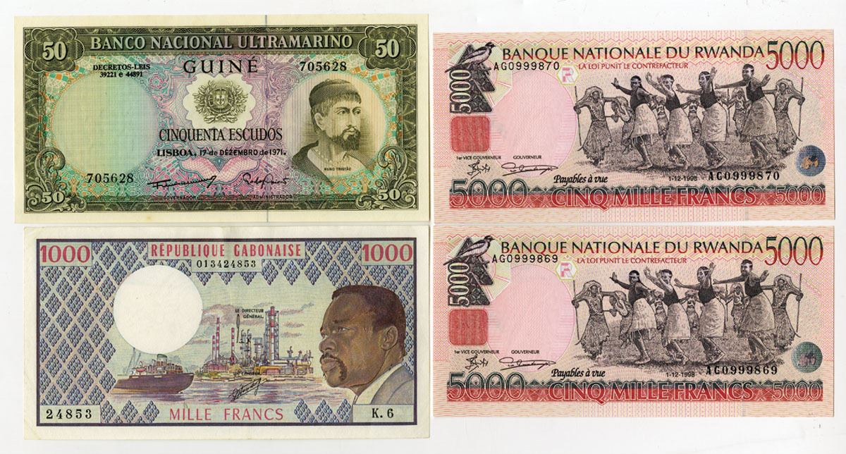 Gabon, Guine, and Rwanda, , 1971-98. Lot of 4 Issued Banknotes, Includes: Banco Nacional Ultramarino Guine 50 Escudos, P-44a, 1971; Banque des Etats de l'Afrique Centrale-Gabon 1000 Francs, P-3b, ND (1974); Banque Nationale du Rwanda 5000 Francs, P-28a (2), 1998. Notes range from AU to Gem UNC condition. (4). Sold "AS IS" no returns accepted.