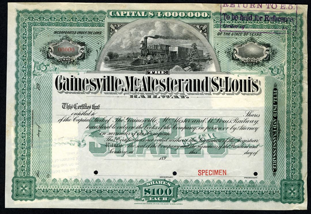Texas, Odd Shares, Specimen stock certificate, Black on green border and undertint, Locomotive R-L, POC, Specimen overprint, Choice Fine to VF with toning upper right, folds lower right. This is the example that is listed and pictured in Cox and very possibly unique. ABNC.