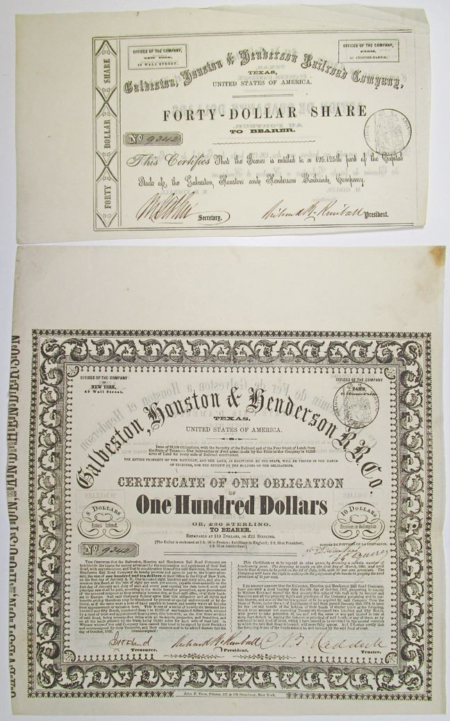 Texas, Lot of 2 pieces, Includes: $100 I/U 8% Coupon Certificate of Obligation Bond in black; $40 Share I/U Capital Stock Certificate in black. Both have matching serial numbers, and are in VF condition.