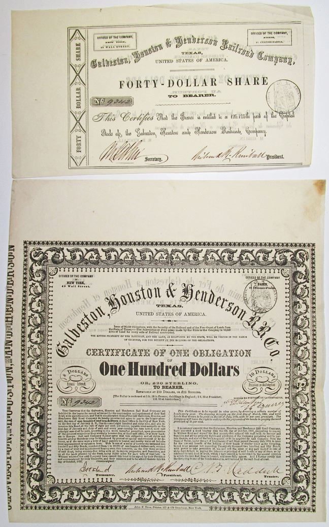 Texas, Lot of 2 pieces, Includes: $100 I/U 8% Coupon Certificate of Obligation Bond in black; $40 Share I/U Capital Stock Certificate in black. Both have matching serial numbers, and are in VF condition. John F. Trow, Printer.