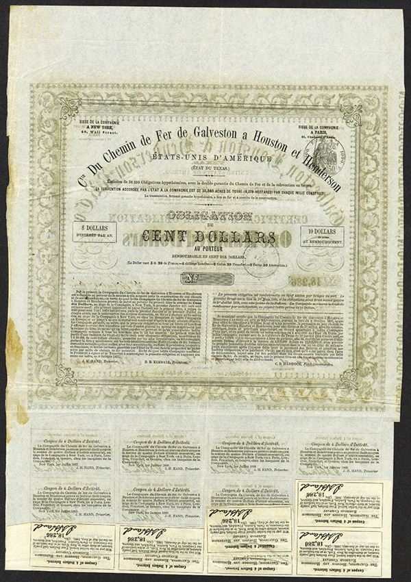 Texas. Certificate for 195.125 part of Capitol Stock and $100, 8% I/U Coupon Bond. Both certificates are in English on one side, and French on the other. Both are VF.