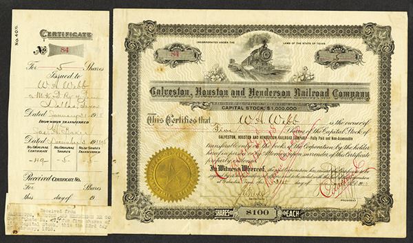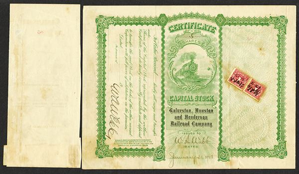 Texas, 5 Shares, I/C, Black with gold underprint, Locomotive in middle, Fine.