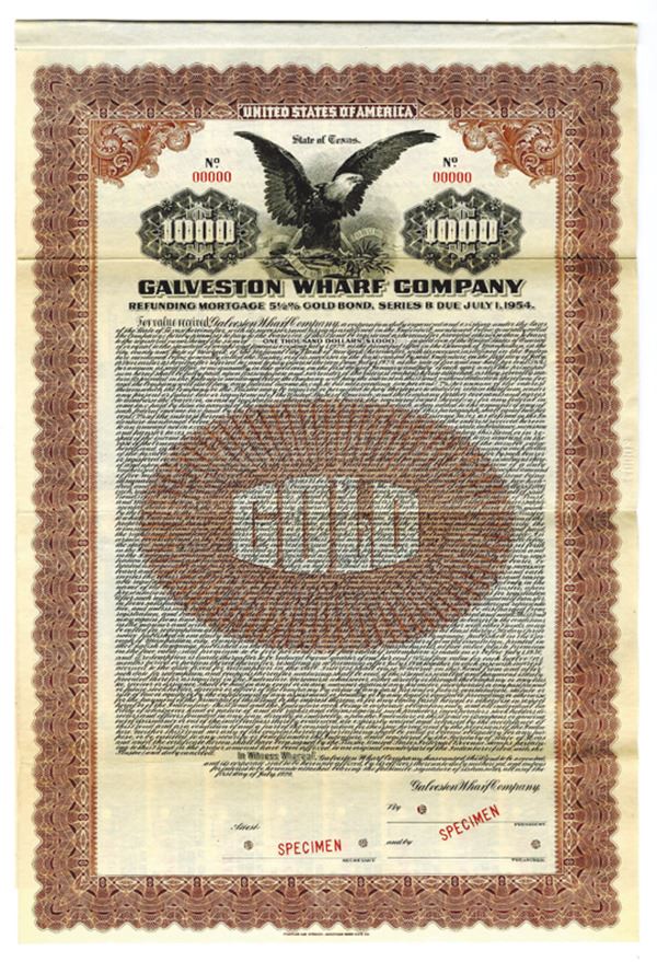 Texas. $1000 Specimen 5 1/2% Series B Refunding Mortgage Gold Coupon Bond, Black print on brown border and under tint, Bald Eagle at top, Specimen overprints and POC's, Fine condition with splitting along fold lines and toning over certificate condition, FL-ABNC.